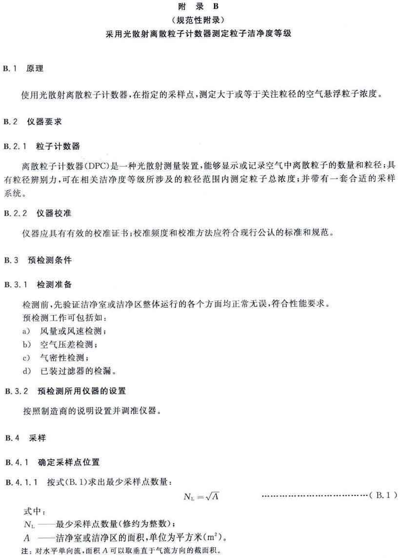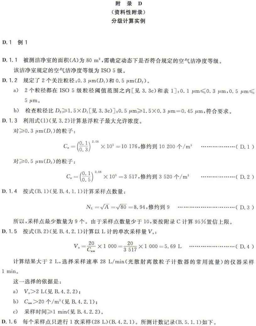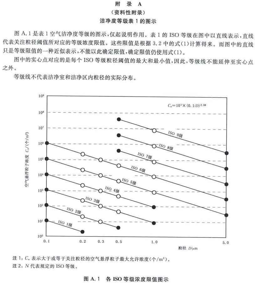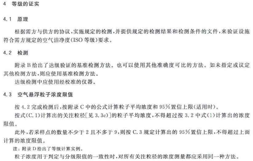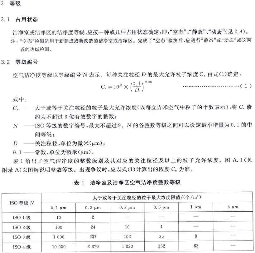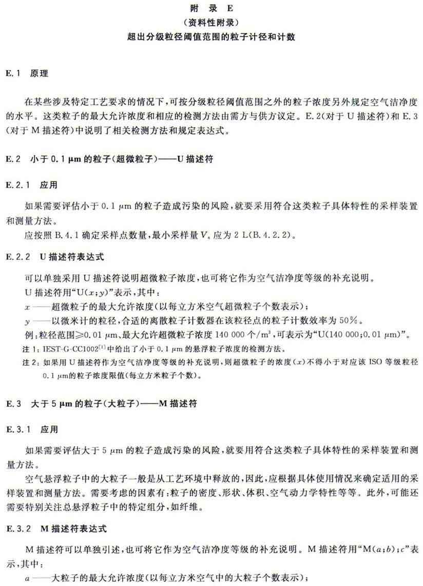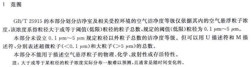 GB/T25915的本部分劃分潔凈室及相關受控環境的空氣潔凈度等級僅依據其內的空氣懸浮粒子濃度,該濃度系指粒徑大于或扥估閾值(低限)粒徑為0.1μm~5μm規定粒徑以外粒子總數的潔凈度等級。但可以用U描述符合M描述符,分別表述超微粒子(<0.1μm)和大粒子(>5μm)的總數。